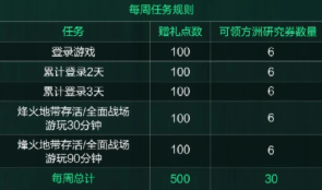 每周累计登录1天、2天、3天分别可获得100赠礼点数,对应可领取6张方洲研究券。