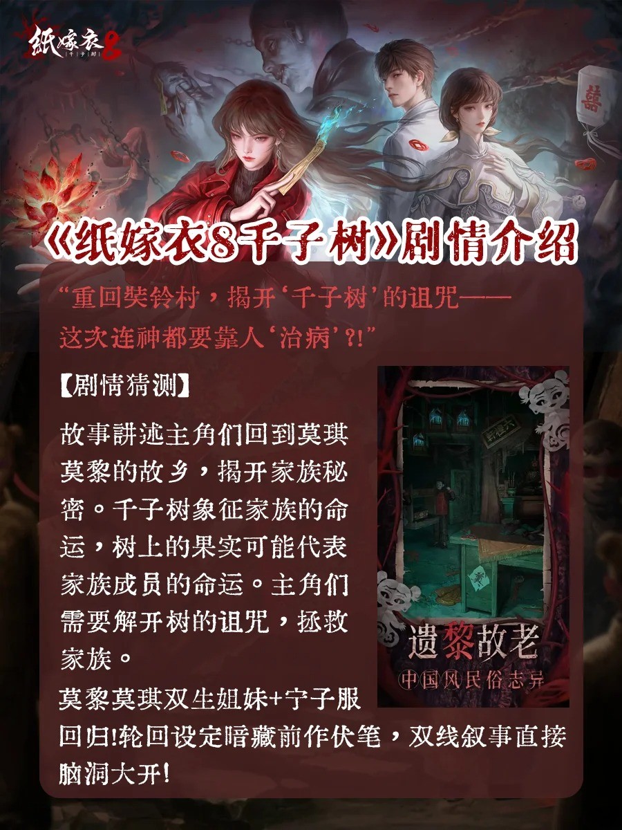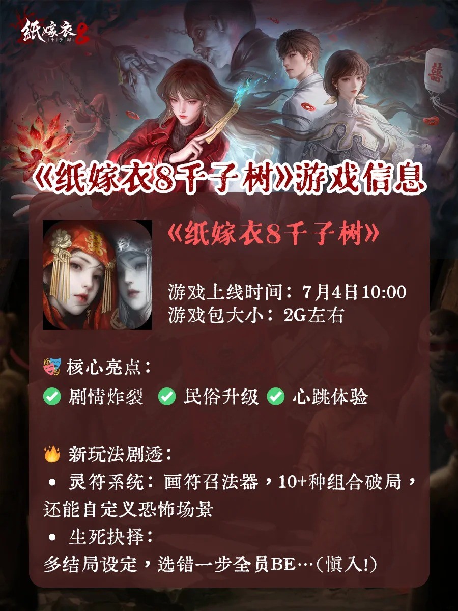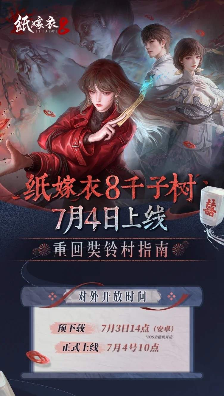民俗悬疑天花板《纸嫁衣8千子树》 将于7月4日10:00震撼上线!本次故事又将回归"奘铃村",以千年诅咒之树为核心,融合了双生姐妹、轮回宿命等炸裂设定,更首次采用了灵符系统+多结局分支的游戏形式,恐怖体验全面升级,接下来小编将整合剧情解析、新玩法解析、下载指南,帮助你第一时间了解游戏信息。