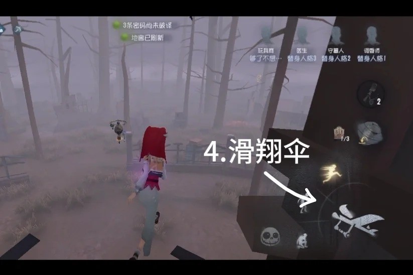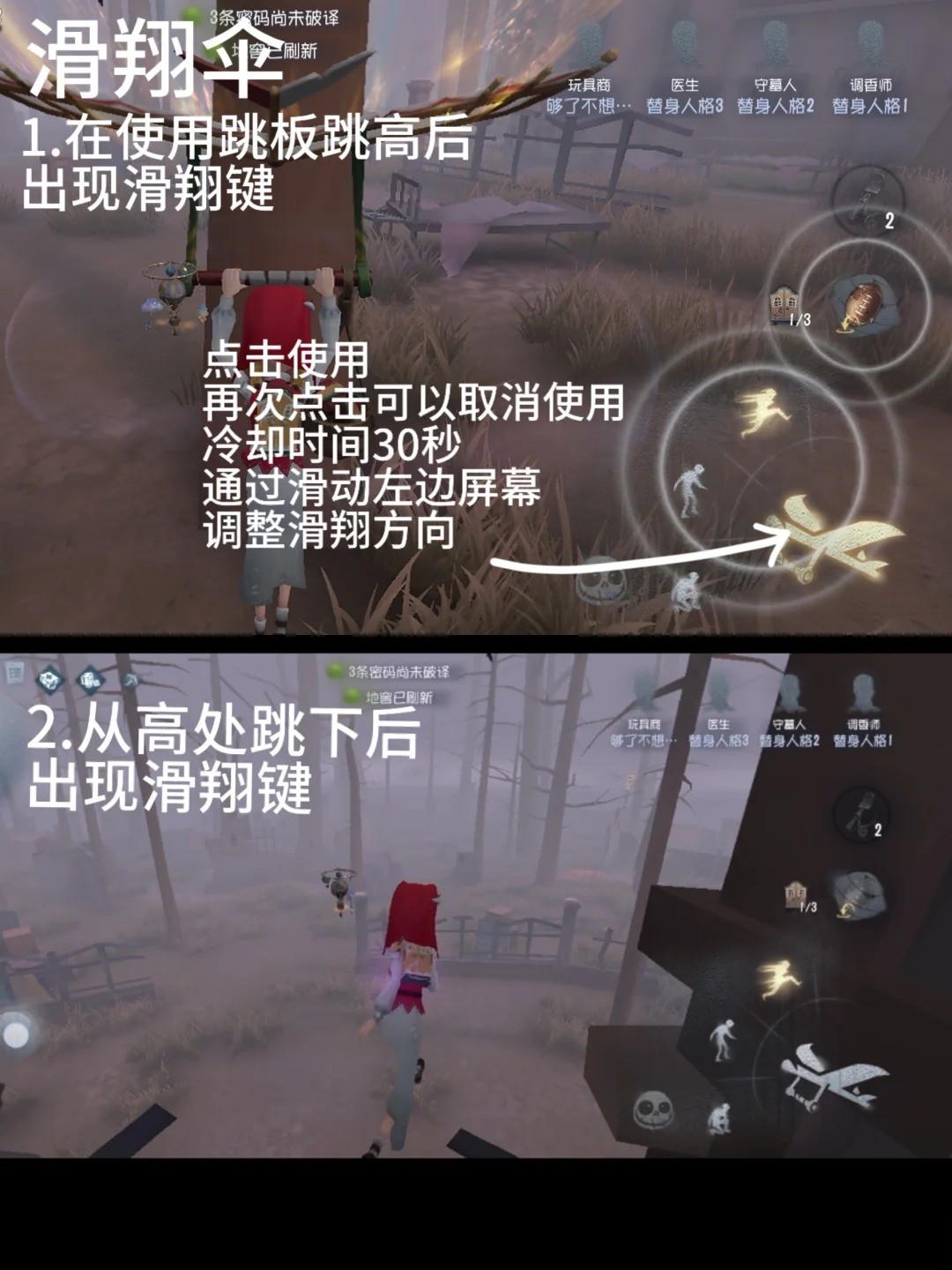 骗刀:滑翔至监管者头顶后取消,诱导出刀。