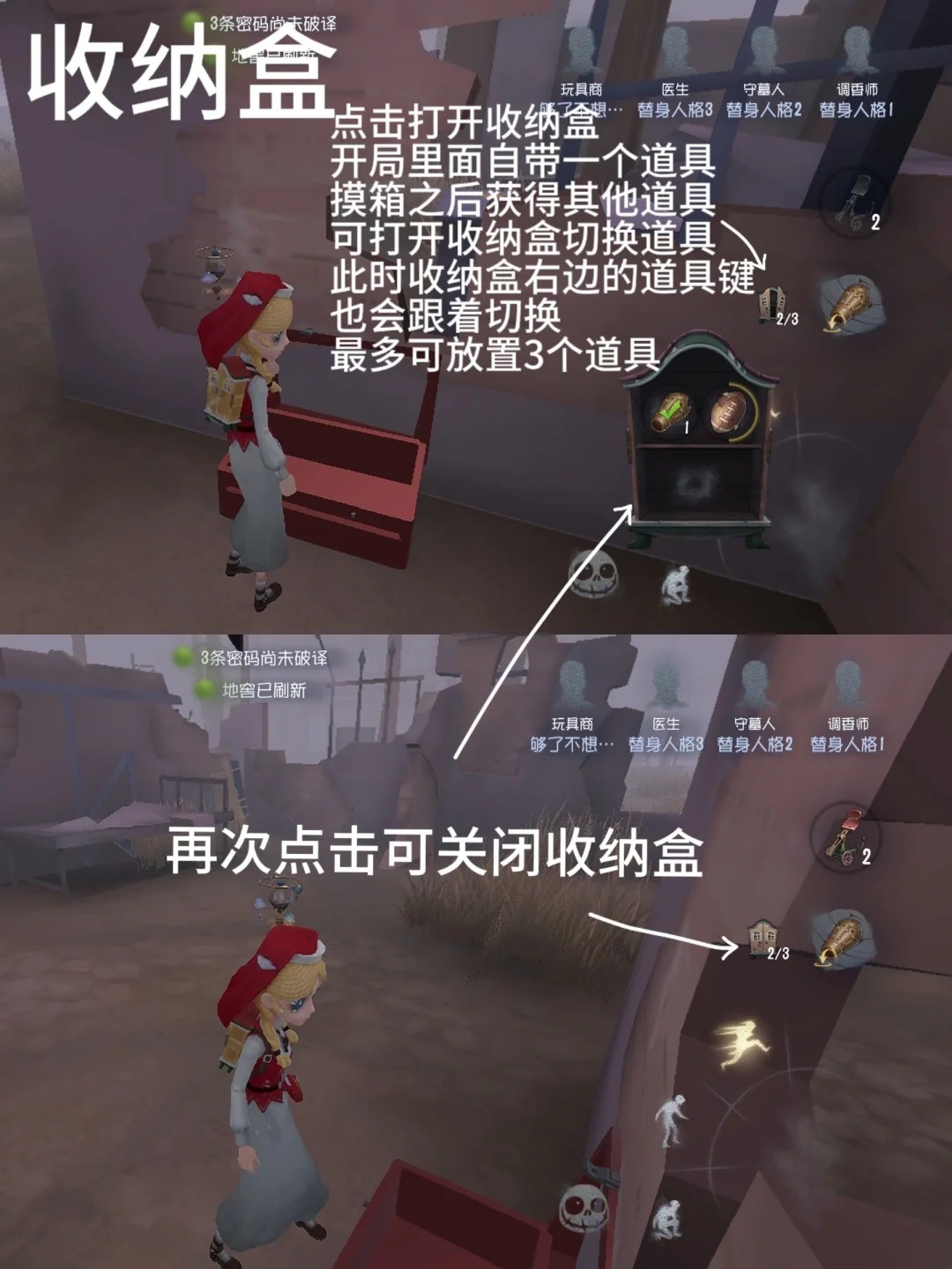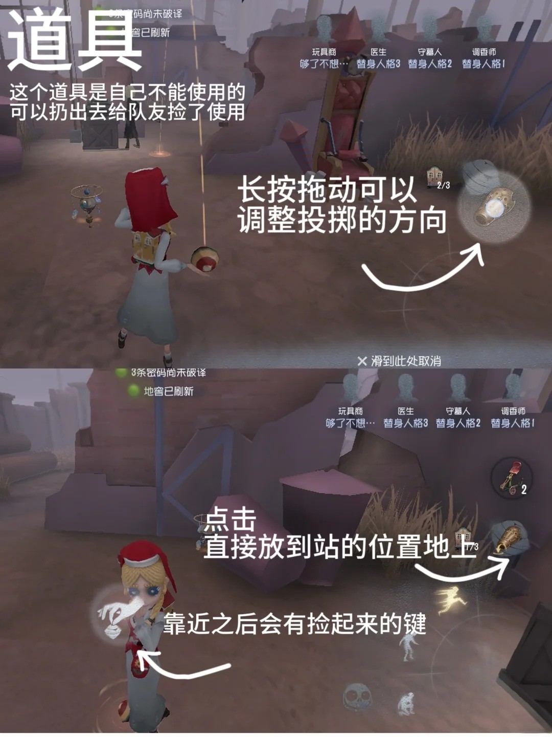 -点击切换道具,长按投掷给队友(如医生针筒、守墓人铁铲)。