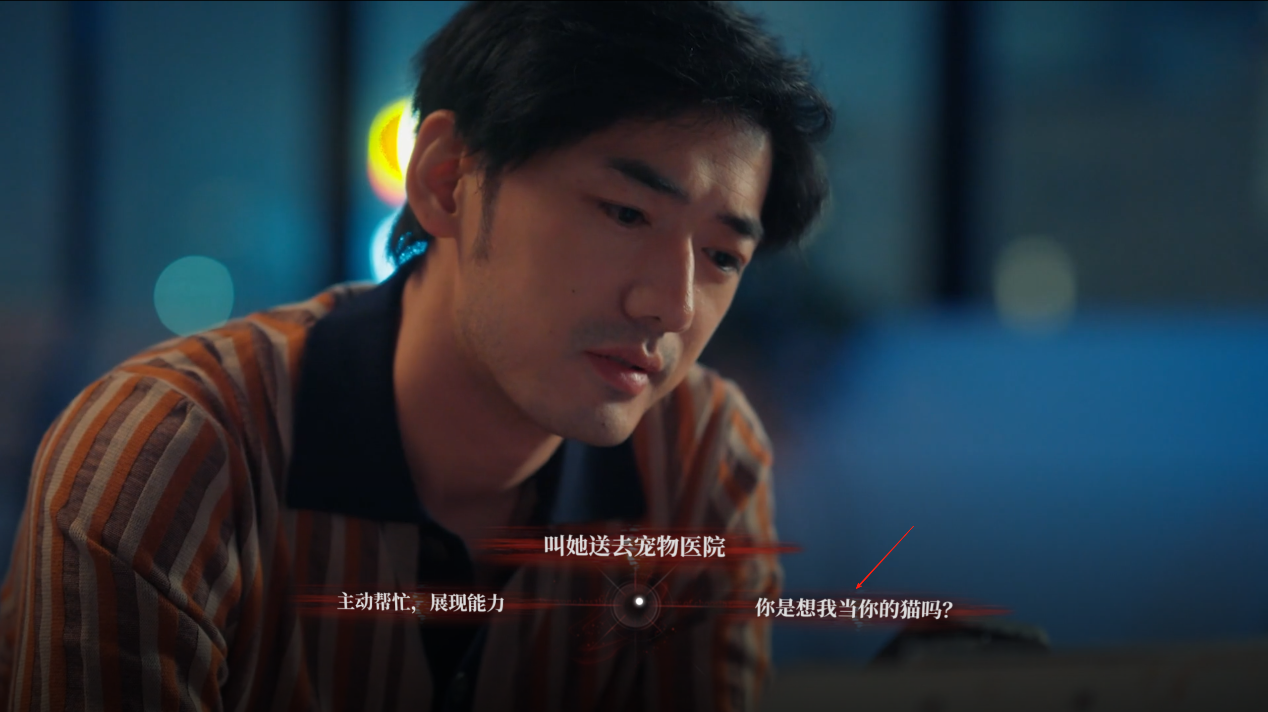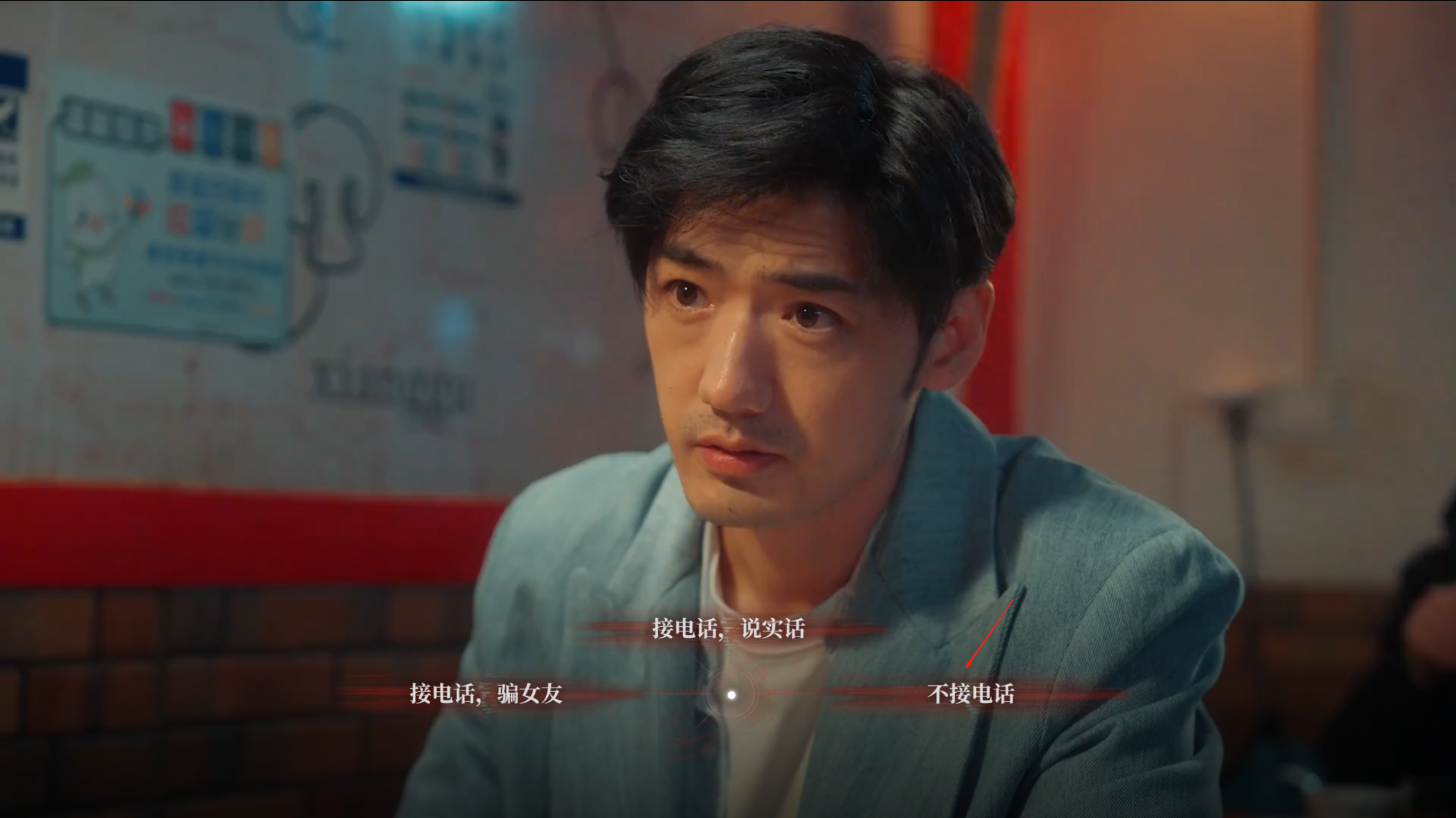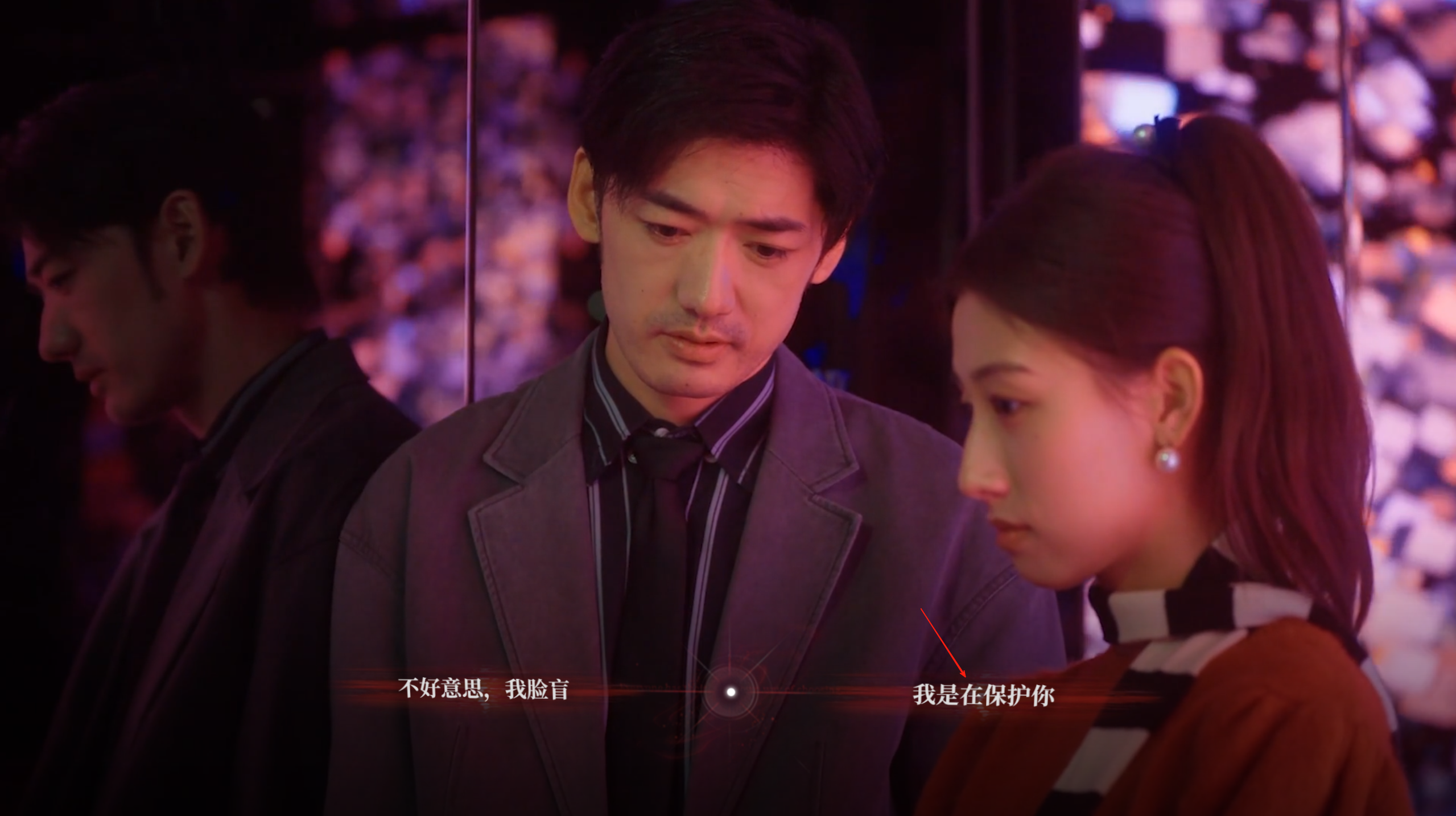 七、来到团建剧情,男主从厕所的酒吧出来,唐晓甜堵住男主触发对话剧情,这里选择”我是在保护你“