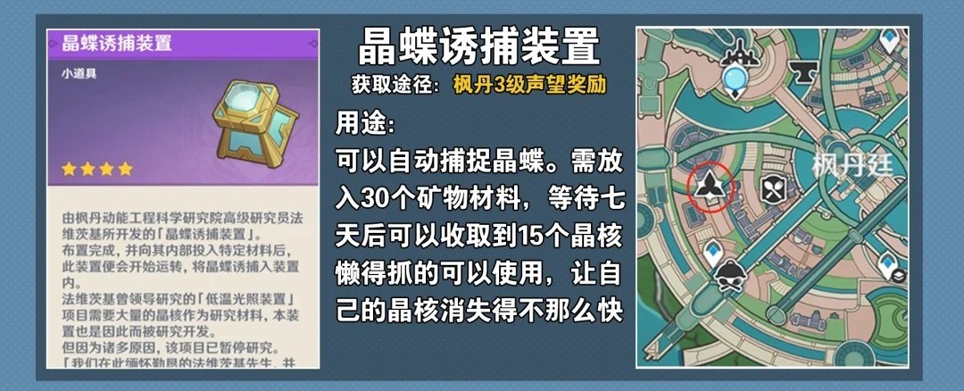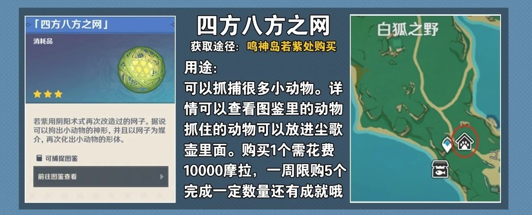 用途:捕捉小动物(如狐狸、晶蝶),装饰尘歌壶或完成成就。