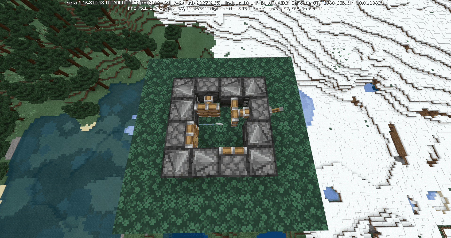 3、随后在三叉戟搅拌机的基础上加高18格,然后用完整方块围绕搅拌机进行加厚,厚度为2格即可。