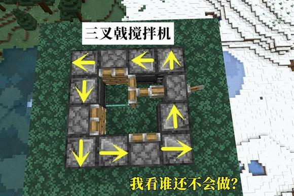 2、修建三叉戟搅拌机,将侦测器、活塞进行摆放,最后投掷一把三叉戟即可。