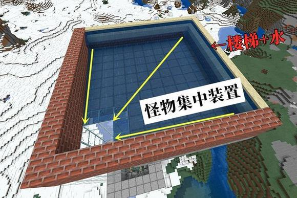 5、然后在玻璃入口的对角的两个边放置楼梯,并对着楼梯倒水,水的流向汇聚在玻璃通道处,当袭击小队生成时,它们便会被水冲至通道。