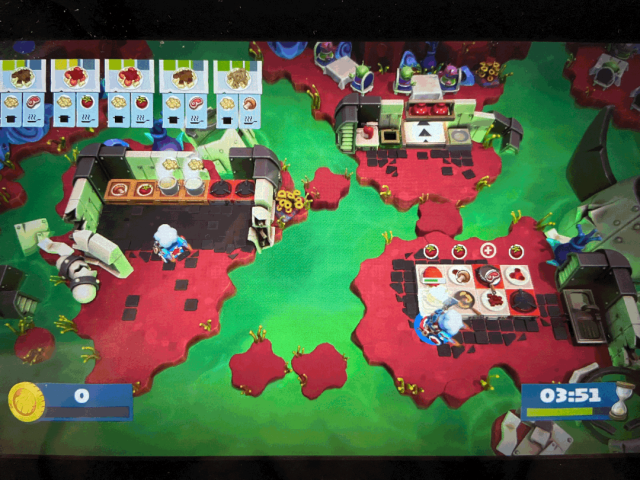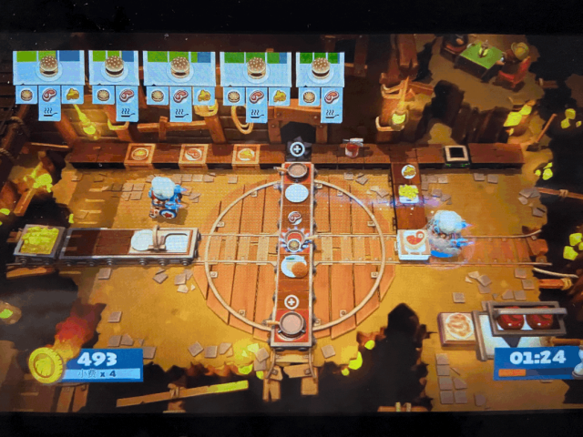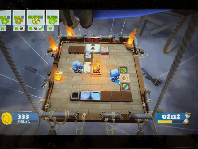 该主题下的菜品大多都是快餐以汉堡为主,玩家需要在山洞的震动中提前感应到菜品发生的转动,比如切菜板会和烹饪的锅具发生交换,不及时调整位置就容易烧糊。这里的Tips是如果是两个玩家的话最好两个人分不同区域操作,不要一起切菜之类的避免来不及逃。