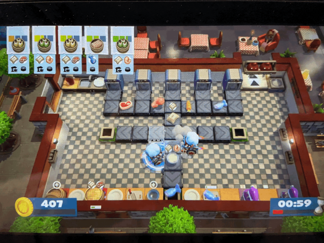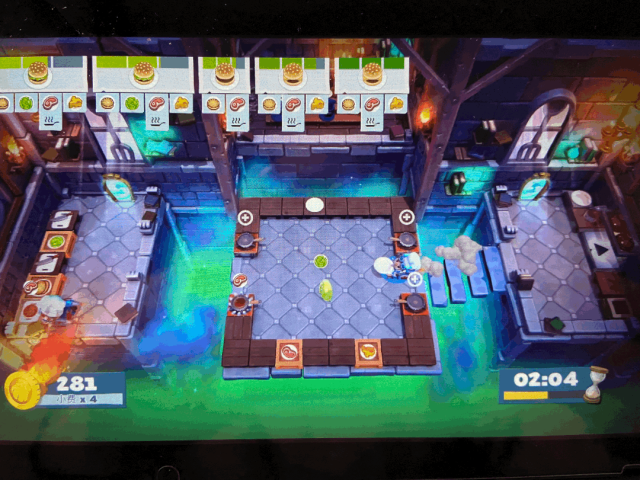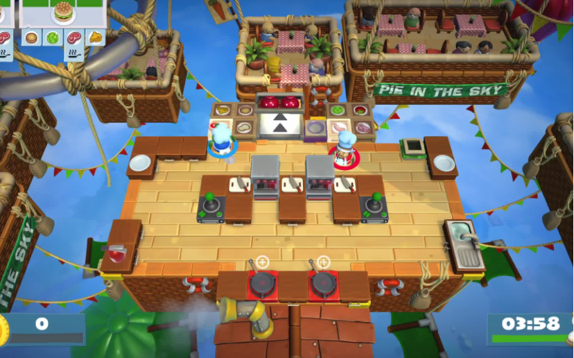 该主题下的菜品大多还是以快餐为主,但是汉堡中加了不少东西像生菜和芝士这种,玩家需要配合的情况下通过任意门转换到另一个场景,比如传菜和切菜之间没有台阶只能进门。开心的一点是这一关卡因为形式比较新可以不用刷碗!