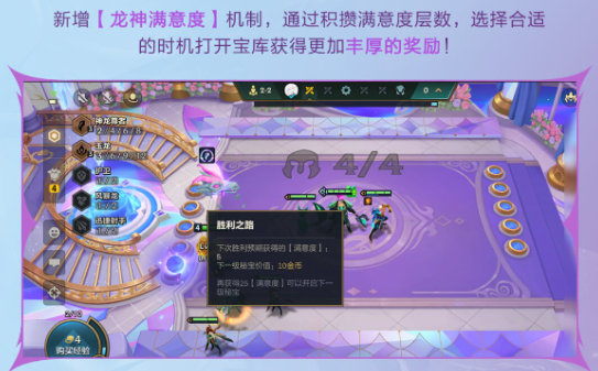 通过完成局内任务积累满意度,解锁不同等级的宝库奖励(如装备、金币或龙神专属强化)。
