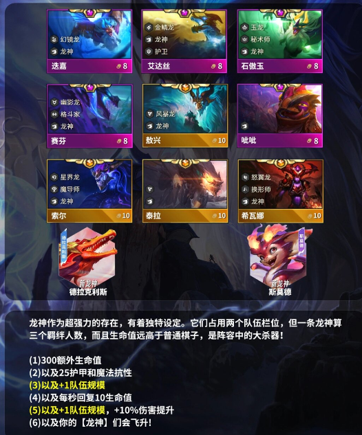 龙神弈子占用2个队伍栏位,生命值和费用翻倍,享受三倍羁绊加成,且每个龙神拥有独特技能机制(如敖兴增伤、泰拉反伤等)。