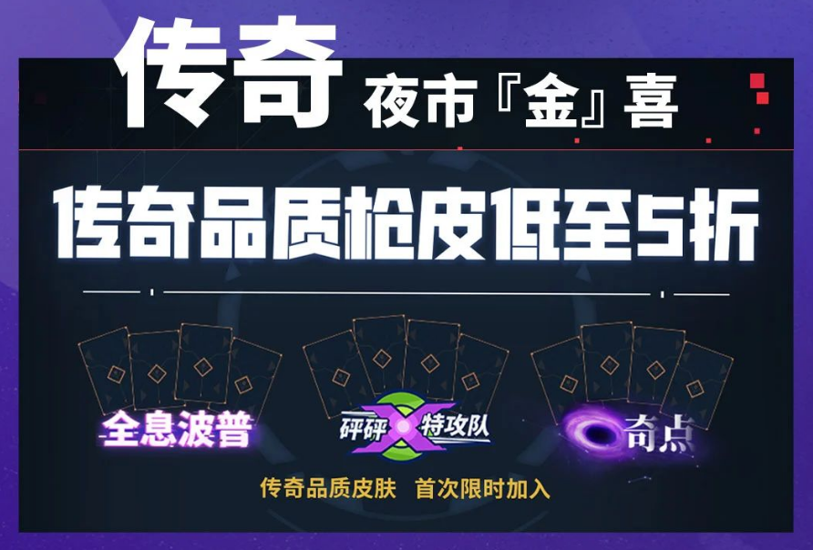 本次夜市在原有夜市规则的基础上,新增了全球5周年限定玩法,将奇点1.0、咻咻特攻队、全息波普1.0套装中的枪皮纳入了夜市池子。也就是说金色传奇品质枪皮也能在夜市中刷到了!以后估计会陆陆续续将老的传奇品质枪皮也纳入夜市池子