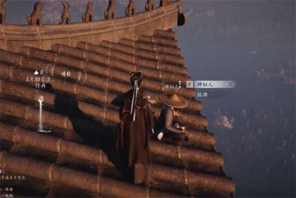 敲钟后,继续向更高处攀登,来到建筑最顶层平台。在屋顶位置可发现一名神秘人,靠近后进行对话。