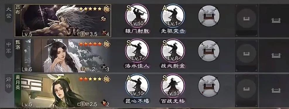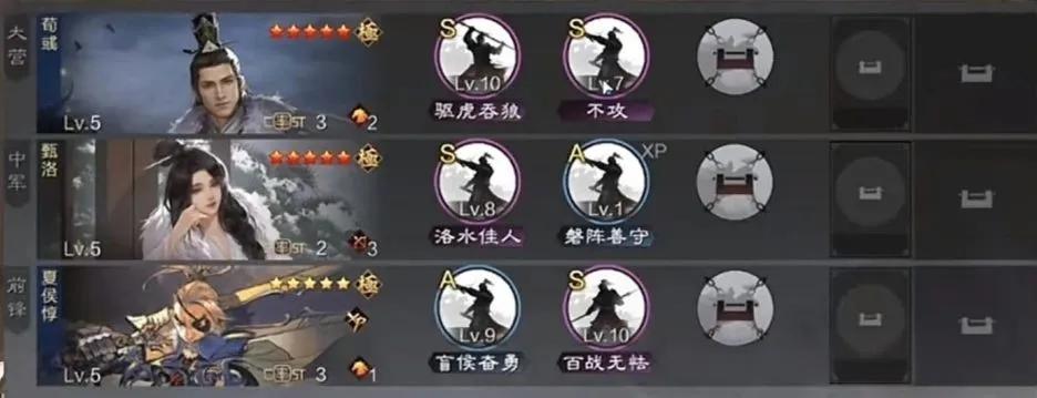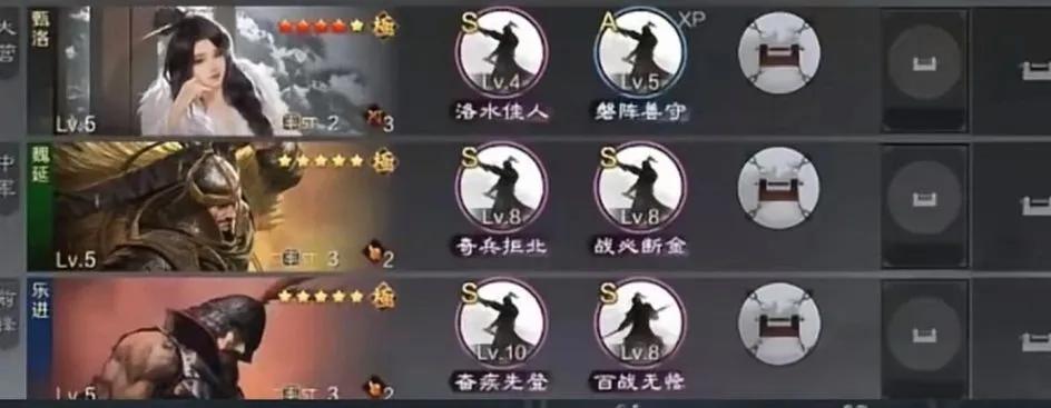 魏延换陆抗也能开,乐进全速加点带百战精兵,10级就能低损开五67。甄洛全谋带占比,魏延全防扛伤害,这队最大优势是稳,后期转乐进肉步,张机换甄洛,垒实+浑水摸鱼组合,打城皮和高级地效率极高,适合平民玩家。