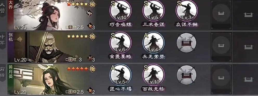开荒独一档,大乔全谋带河内,黄月英加10速后全谋叠匠心,乐进全速带百战1012。抽到减C陈寿特性后,黄月英直接换张机,秒变“大黄机”,开荒节奏飞起。这队强度碾压,15小时三觉不是梦,转型后打地打架都无敌,唯一门槛是需要2.4万战法经验打底。
