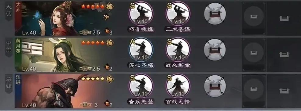 满红大佬专属,大乔河内世泽+兵无常势,黄月英匠心+桃园,张机垒实+浑水,12级就能无脑开五89。这队输出爆炸,战损极低,唯一缺点是吃战法经验。转型直接转大乔法刀,打城皮和高级地都是T0,别碰反计队伍。