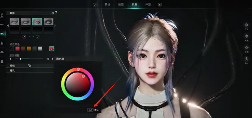 调整细节参数:滑动调节条修改五官比例、肤色、发型颜色等细节。