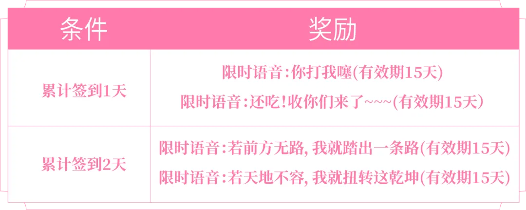 累计签到1天:可获得限时语音“你打我噻”和“还吃!收你们来了~”,有效期均为15天。