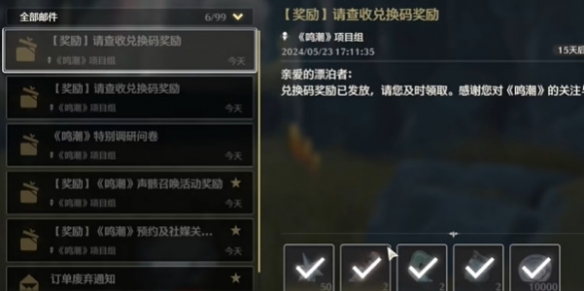 5、最后输入兑换码后在邮件中即可领取奖励。