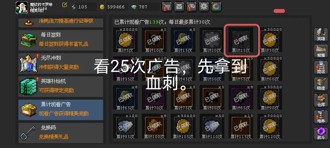 毒夫人通关到30关才能解锁,所以前期我们可以先看广告25次,拿到血刺角色,这个角色是属于单体伤害主c,还没打到30关先拿血刺来过度会好一些,血刺过度30关后解锁了毒夫人就可以把血刺换成毒夫人。