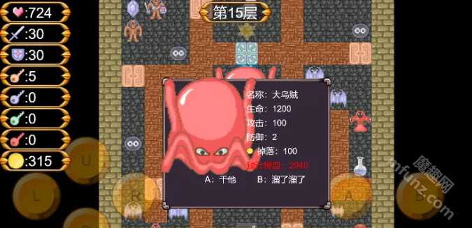 过了10层以后先去15层找大乌贼,因为有0层补给层的原因我们可以选择硬刚大乌贼,之后可以通过大乌贼身后的传送门直通48层,拿到加50攻击的圣剑。
