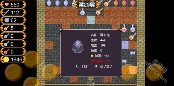 之后就可以去11层击败两个红法师拿到银盾,去17层击败守卫拿到银剑,19层找到藏在十字形墙壁中的十字架,至此基本可以在10-20层横着走了,击败14层左上角三个兽人武士拿到红钥匙,然后就可以去挑战20层的吸血鬼了,过程中如果血量不够或者钥匙不够就去搜刮一下,基本还是够用的。