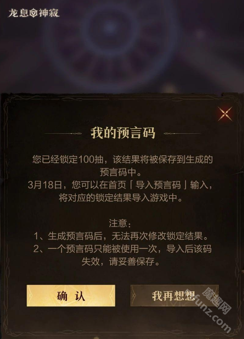 4.导入预言码:3 月 18 日「导入预言码」功能解锁,这时候从自己生成的预言码里选一个导入,确认之后,最终「预言召唤」的抽卡结果就锁定了,一个预言码只能用一次,导入就失效,一定要保管好!