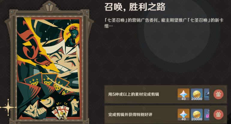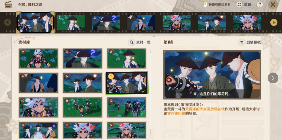 原神剪影辑帧第三关的内容以荒泷派发放零花钱的事件为引子,引出七圣召唤的宣传词,最后以久岐忍的花絮作为结尾,形成了一则精彩的七圣召唤宣传广告。共有12个镜头,需要大家根据脚本依次将素材内容摆放好。