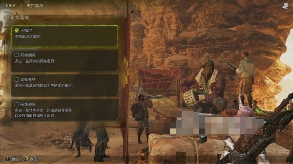 与支援船店主【桑提亚哥】对话选择【进货需求】可以更改支援船商品列表的倾向,选择的需求不同,进货需要的时间也有所区别,但差别不大,例如将需求改为【装备素材】,所需时间大约为19分钟;改为【杂货道具】则所需时间大约为23分钟。不过无论选择哪个需求类型,都不会影响调查团票的出现概率。