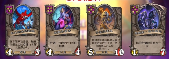 5.遗骸看管者:三本随从,普通召唤3个1/1骷髅,金的召唤6个,是重要亡语触发胚子,易获取,可点金。