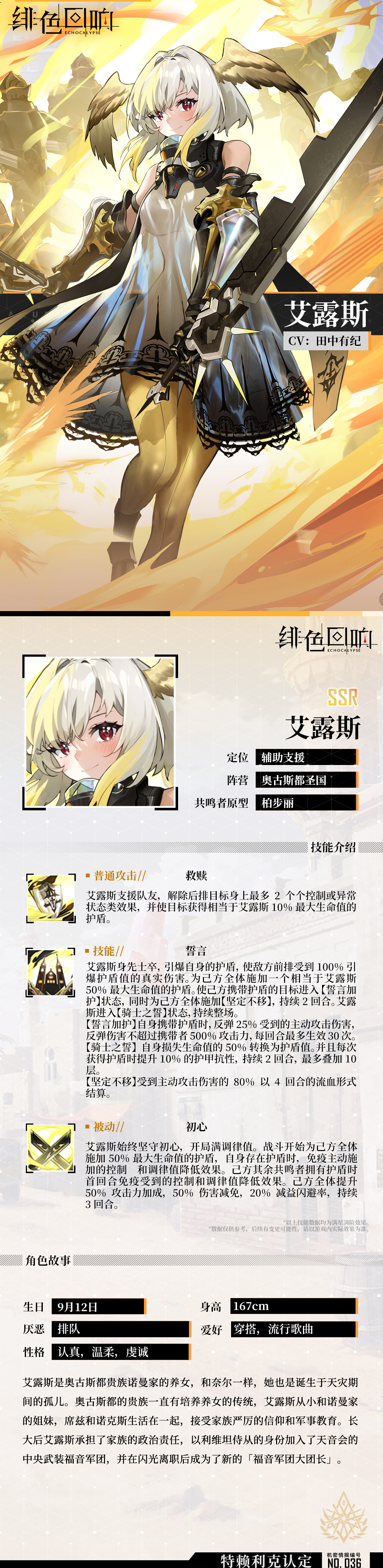 3.初心:艾露斯始终坚守初心,战斗开始时携带一个 30% 最大生命值的护盾。这使得艾露斯在战斗一开始就具备较高的生存保障,30% 最大生命值的护盾能够帮助艾露斯在战斗初期抵御敌方的先手攻击,无论是敌方的普攻还是技能伤害,都能被这个护盾吸收一部分。让艾露斯有机会在战斗前期稳定地释放技能,为团队提供支援和保护 。