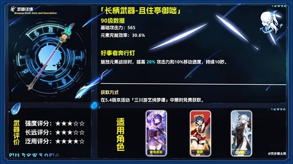 在原神5.4版本的三川游艺绮梦谭限时活动中,玩家可以兑换获得一把全新的长柄武器且住亭御咄。作为一把长柄的武器,而且是活动获取的,大家对它都很感兴趣。由于人人可得,所以很多玩家也是比较纠结,原神且住亭御咄可以给谁用?强度又有多高呢?下面就和小编一起来看看吧!