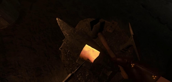 5.加热环节:将需要锻造的工件放在火上加热,使用风箱持续鼓风,加热到工件呈现亮黄色,接近冒烟状态最佳。例如打造剑类武器,一般吹风箱16次左右就能达到合适温度;斧头类则大概17次。这个时候不要担心过热,即使亨利提示过热也没关系,继续加热即可。