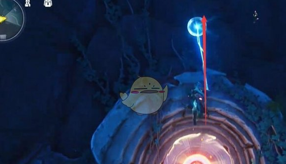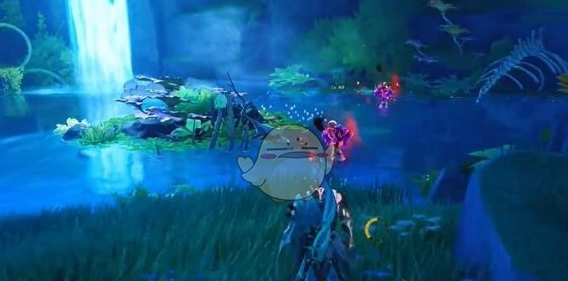 靠近瀑布后,留意周围的地形,会发现一个水塘。刺玫菇就位于这个水塘之中。值得注意的是,刺玫菇通常会有一些环境元素相伴,比如周围可能会有独特的光影效果或漂浮的粒子特效,这些都能帮助你更准确地锁定它的位置。