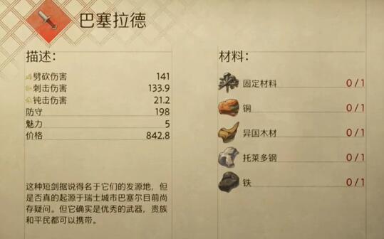 短剑在游戏中以其敏捷和快速的攻击方式受到部分玩家的喜爱,而四阶巴塞拉得短剑更是其中的佼佼者。这把短剑的一大优势就是前期容易获取,玩家不需要花费过多的精力和时间去寻找。当锻造到四级后,它的属性表现十分亮眼,甚至超过了【塞米的贵族长剑】。