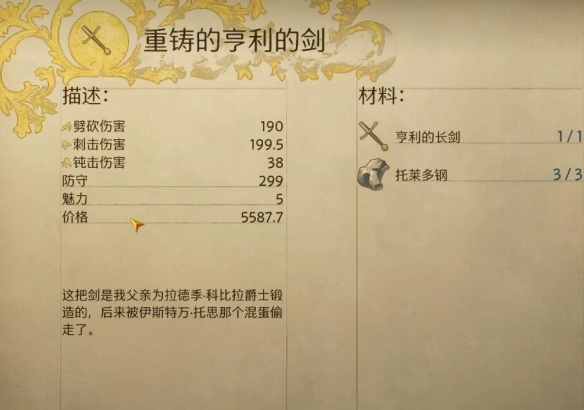 重铸亨利的剑是一把属性非常高的武器,拥有它能在战斗中获得极大的优势。然而,它的获取方式相对复杂。玩家需要先重铸拉德季的剑,才能解锁重铸亨利的剑的配方。而且,这个配方需要通关主线才能拿到,这意味着玩家在游戏前期无法使用这把强力武器。当玩家花费大量时间通关主线拿到配方并制作出重铸亨利的剑时,游戏进程可能已经接近尾声,此时这把武器的实际作用可能会大打折扣。