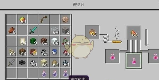 3.二级治疗药水:在酿造台上,把粗制药水放在下方,上方加入闪烁的西瓜片。闪烁的西瓜片由金粒和西瓜合成,这能赋予药水强大的瞬间回血能力,危急时刻能让玩家迅速脱离残血险境。