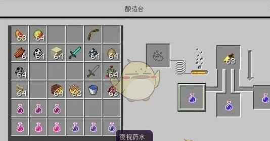 12.夜视药水:用粗制药水和金胡萝卜酿造,金胡萝卜由胡萝卜和金粒合成。夜视药水能让玩家在黑暗的洞穴、夜晚环境中视物清晰,挖掘矿物、赶路都方便许多。