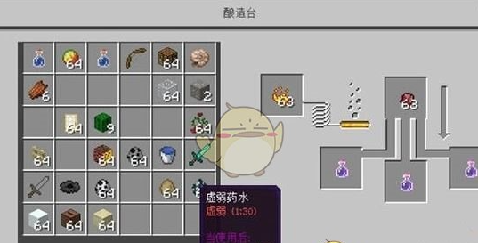 7.普通虚弱药水:在酿造台用粗制药水和发酵蛛眼合成。发酵蛛眼由蜘蛛眼、糖和棕色蘑菇制成,被虚弱药水击中的目标攻击力大幅降低,无论是困住怪物还是在玩家对战中限制对手,都十分有效。