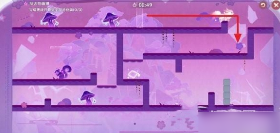 2.前往上层:利用场景中的松鼠和薄固定平台,跳到上层。到达上层后,再次切换至噩梦状态,把序号②处的蘑菇引到星标位置,为后续行动做准备。接着切换回美梦状态,向右走。随后又切换到噩梦状态,将序号③处的蘑菇引到蓝圈固定墙的左侧。此时,操作小狐狸穿过蓝墙,然后迅速切换回美梦状态。这样就能把两只蘑菇都堵在蓝墙后方,顺利通过该区域。这里的操作要点是记住蘑菇位置和切换梦境的时机,保证小狐狸能顺利穿过蓝墙且不被蘑菇阻碍。