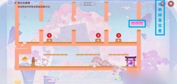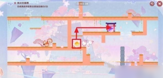 7.收集第三枚油豆腐并前往拉面店:到达星标位置后,乘坐界面右侧的灰色移动平台来到上层,切换至噩梦状态,拾取左侧高层的油豆腐。迅速跳过固定墙壁来到左侧区域,切换至美梦状态。然后不断切换美梦/噩梦状态,穿过挡路的固定墙壁,并且利用不断向上移动的灰色阶梯状移动平台,逐步到达最后拉面店所在平台。这一段路程较为复杂,需要熟练掌握梦境切换和利用移动平台,多尝试几次就能找到最佳路线。