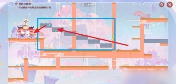 3.收集第一枚油豆腐:穿过蓝墙继续前行,切换至噩梦状态,跳到中层。然后切换成美梦状态,从缺口往下跳。注意观察灰色移动墙(蓝框所示)的位置,当它到达缺口后方时,快速通过并往左走,拾取第一枚油豆腐。拾取后,从薄固定墙壁跳到中层,进入鸟居前往下一个场景。这一过程中,把握移动墙的移动规律和通过时机是成功的关键。