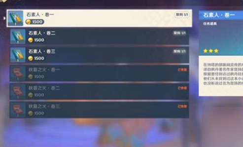 获取方式:到达纳塔“烟谜主”传送锚点后,向前走进入烟谜主大门,向左前方寻找,找到“伊杜坎的秘藏”店主阿马佐利,与他对话,就可以购买到《石素人》其一、其二、其三。这三本书籍中或许蕴含着纳塔地区不为人知的历史、文化和故事,是深入了解纳塔的重要资料。