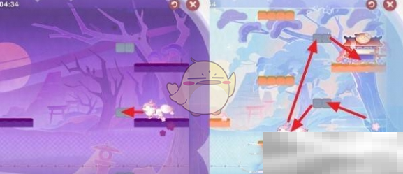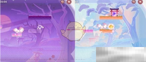 3.拾取油豆腐之后,往回跳到灰色移动砖块上,再切换回美梦状态,跳到普通的移动砖块上。当到达拉面店所在平台上方后,再跳回灰色移动砖块上,最终顺利到达拉面店,完成关卡挑战。