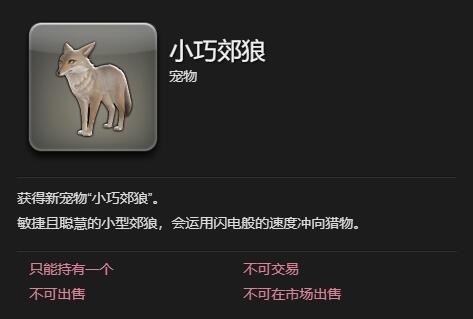 4.小巧郊狼不可交易和出售,也就是说它只能陪伴你自己闯荡游戏世界,无法转让给其他玩家,也不能在市场上进行售卖。