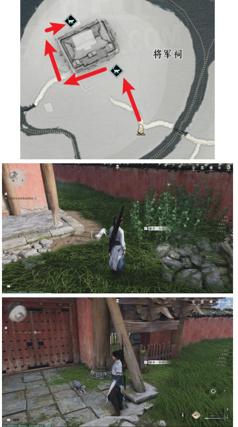 翻越红墙后可见第一只;绕至祠堂后方及山洞内可找到剩余两只。