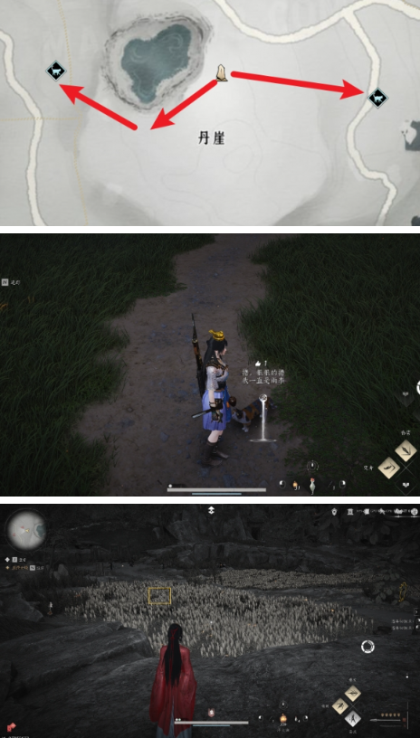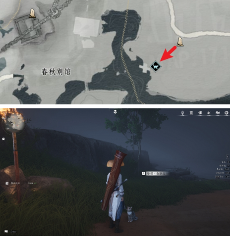 沿东南方小河行走,靠近悬崖处触发互动。