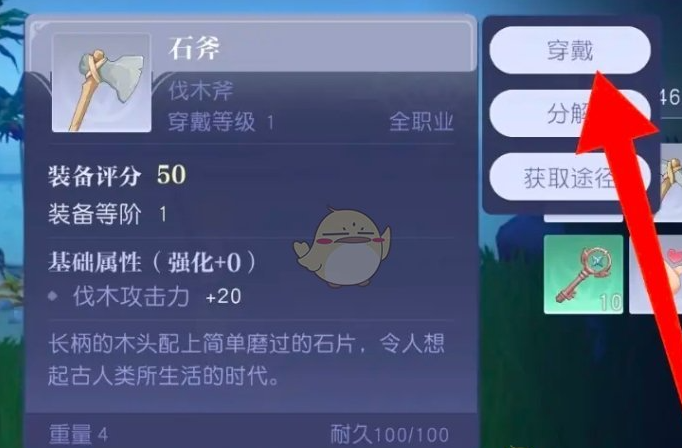 3.完成穿戴:在详情页面中,点击“穿戴”按钮,即可将石斧装备上身。