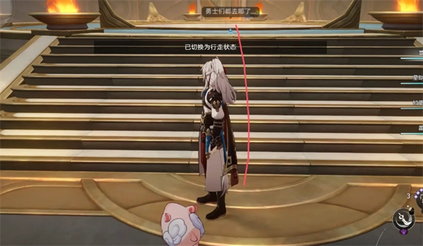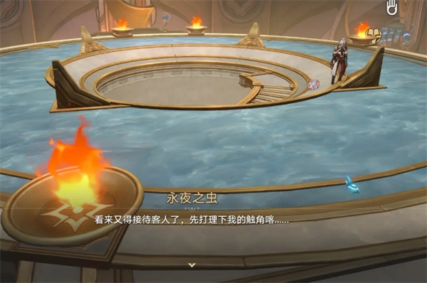 直行至可能的核心区域。若已解锁相关任务并开启下方路径,可直接进入外围的黄色光圈区域。进入光圈后,选择右行,将再次触发与若虫的对话。在对话中,选择“有4位勇士”,即可获得宝箱。