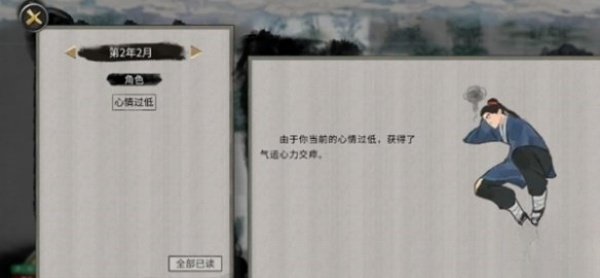 2.避免负面效果:心情低于50时,每月初结算时会受到“心力交瘁”气运影响,每月减少10点精力。低心情还会妨碍与NPC互动,增加学习技能时心魔球触发几率,影响技能习得成功率。