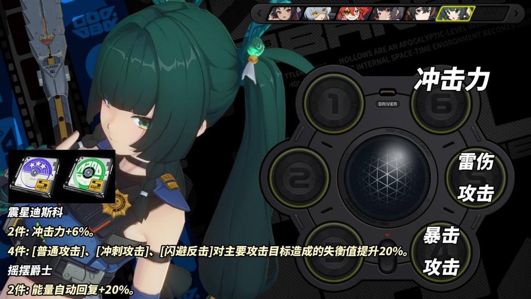 1.在驱动盘的选择上,我们推荐使用4震星迪斯科2摇摆爵士套装。主词条建议选择4号暴击/攻击、5号雷伤/攻击、6号冲击力;副词条则优先选择攻击力、暴击伤害和暴击率。
