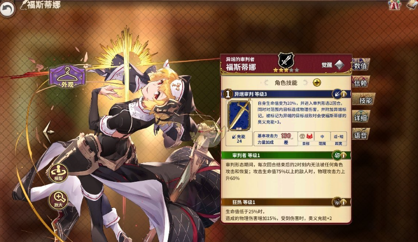 效果:释放后,福斯蒂娜的生命值降至20%,同时解除自身的燃烧、中毒、触电和冻结状态(满级时)。进入持续2回合的审判形态,对范围内目标造成物理伤害并附加异端标记。被标记为异端的目标战败时,将为福斯蒂娜增加奥义充能(满级时为3点)。